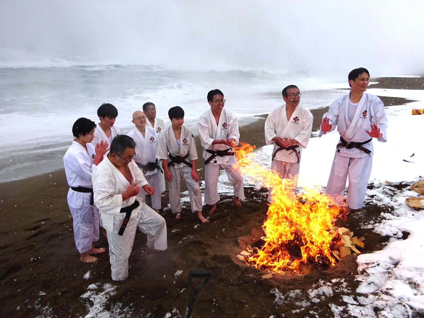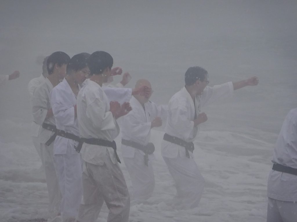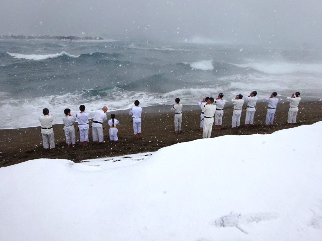 2026年 寒稽古 雪ふりつむ お知らせ 2026.01.09 1/2 鷹巣海岸は一面の雪景色 40数年の寒稽古の中でこんな景色は3回くらいしかありません。風雪強く、波は逆立ち人を寄せ付けないほどの厳しさ。そんな中、福井市協会の拳士、有志があつまりました。6才から70代まで今年1年の思いと願いを大海に向かって誓い、心と体の修練に向き合う意気を示します。身体のつらさは一場、心が折れてはいけません。自己の確立こそ大切な一歩と思いましょう。